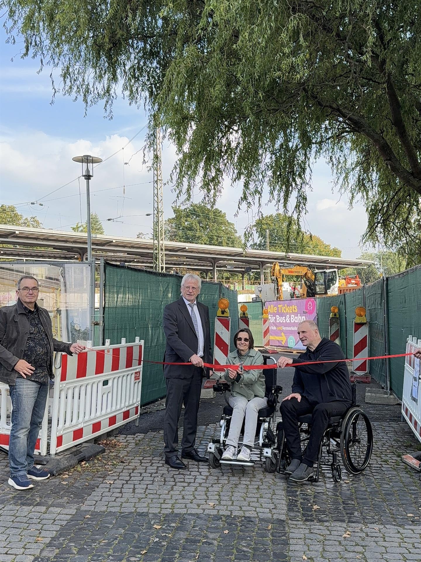 Foto: v.l.n.r.: Jürgen Spenrath (Bürgerbeteiligung), Bürgermeister Dieter Freytag und die Vorsitzenden des Inklusionsbeirates, Silke Katzfuß und Ralf Bauer, bei der symbolischen Teileröffnung des geneigten Gehweges.Am vergangenen Dienstag, den 30. September 2025 war es endlich soweit: Bürgermeister Dieter Freytag konnte mit Mitgliedern des Inklusionsbeirates sowie an der Planung und am Bau beteiligten Mitarbeitenden und Firmen symbolisch den geneigten Gehweg am Bahnhof Brühl freigegeben, der fortan barrierearm von- und zu der Personenunterführung und den Gleisen führt.