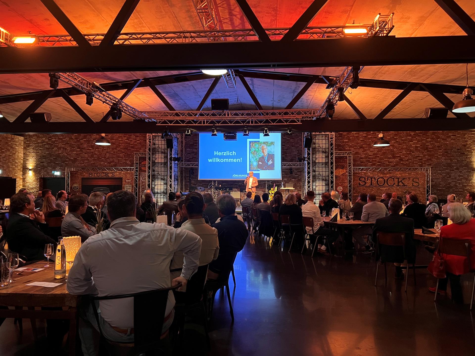 Anschließend begrüßte Bürgermeister Dieter Freytag gemeinsam mit dem Mitveranstalter, der IHK zu Köln, vertreten durch Bastian Lublinsky (Vorsitzender des Wirtschaftsgremiums Brühl der IHK Köln), die knapp über 100 Gäste, bevor Jörg Runge, Trainer, Coach und Speaker, das Mikro übernahm und einen Impulsvortrag zum Thema „Erfolgsfaktor Glück – Warum glückliche Menschen Unternehmen nachhaltig stärken“ hielt.